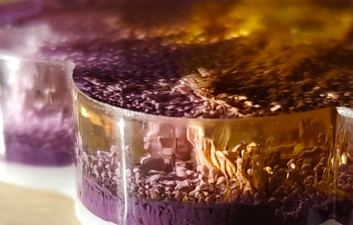 Unter anderem kann man Dinge (getrocknete Pflanzenteile, Steine, Muscheln,..) im Harz einschließen und somit konservieren. Ebenso kann Farbe dem Harz beigemischt werden. Die Bewegung der Farbe wird im Harz festgehalten, ein flüchtiger Moment für immer bewahrt – faszinierend: das ist Farbe in Form!